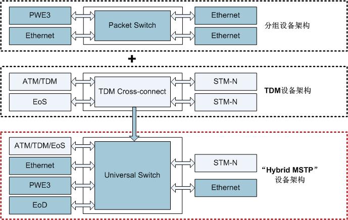 OptiX OSN设备采用“统一交换”架构,实现对分组业务和TDM业务的统一调度,构建灵活的应用模式:纯分组模式、纯TDM模式和混合模式(分组+TDM)。